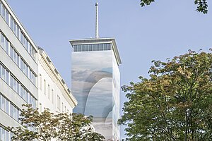 Due to start in the next few days, work on adorning the Ringturm’s facade is scheduled for completion in the middle of June. The 4,000m2 artistic covering is made up of a total of 30 printed netting sheets, each around 3m wide and up to 63m long. For this year’s wrapping of the landmark building, Slovenian artist Vanja Bućan has carved icebergs into the summertime setting, while a group of bathers have gathered below to enjoy the magic of the coastal scenery. “I want my painting to highlight nature’s inherent potential for change. Like the people in my picture, all of us are only tiny fragments of a larger context. Wandering icebergs have become a symbol of climate change. For me, they also represent just how unpredictable events can be – at this particular moment on the beach, it’s not entirely clear how the day will turn out for the bathers,” said Vanja Bućan of her work.