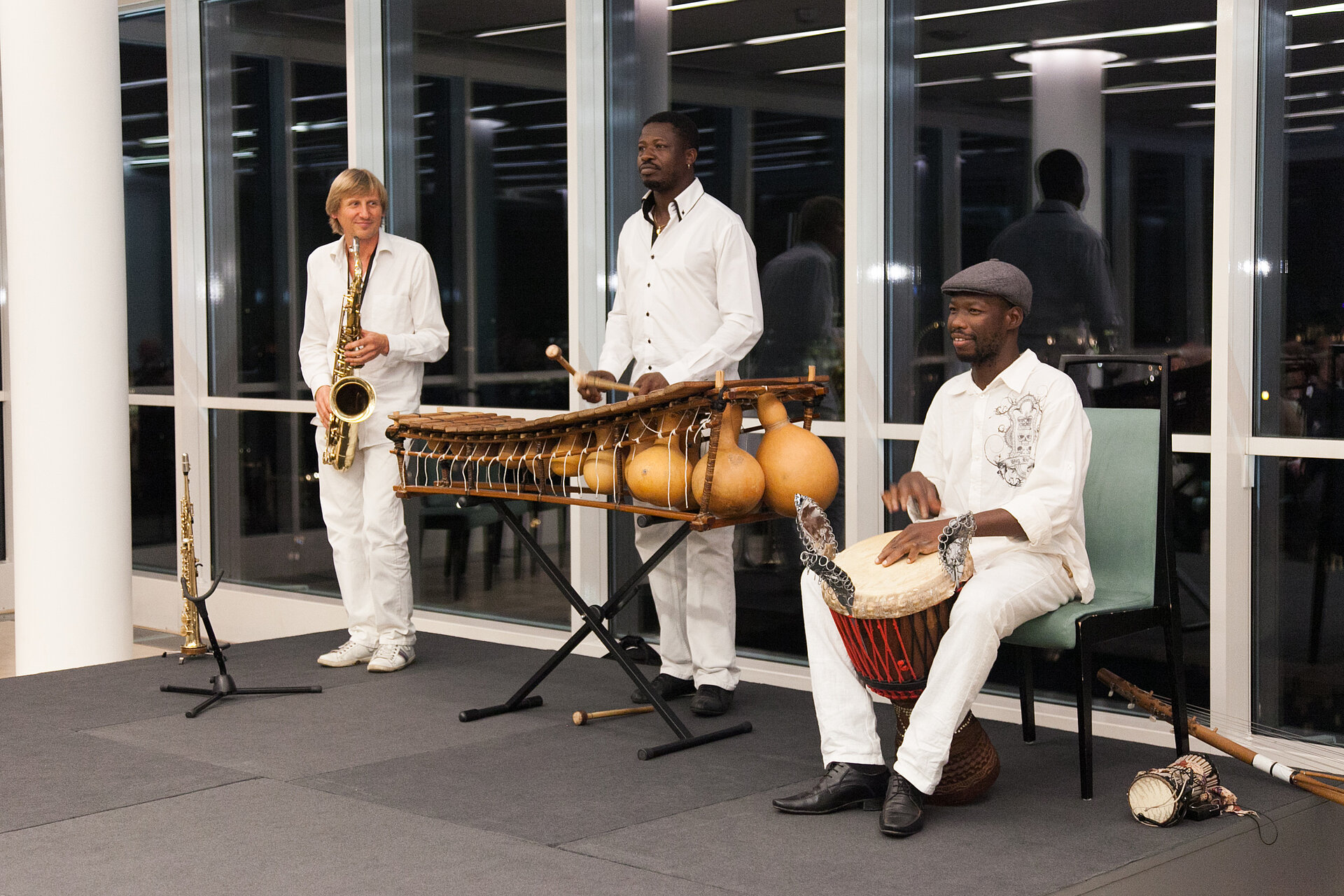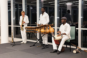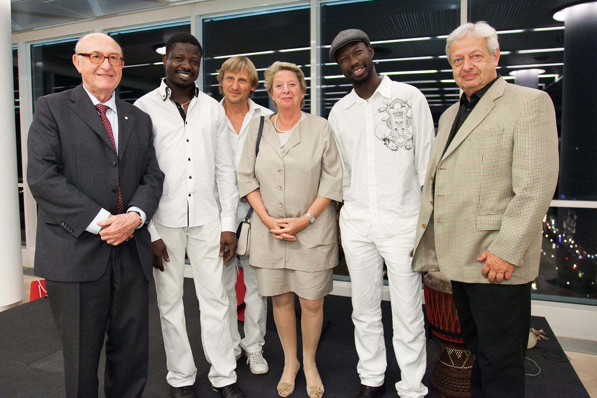 Kunst im Turm mit DDr. Wolfgang Graninger: „YALA – Afrika, wer fährt heute noch dort hin?“ Am Bild v.l.n.r.: Dr. Günter Geyer (Vorstandsvorsitzender Wiener Städtische Versicherungsverein), Mamadou Diabate (Balafon, N'Goni), Sigi Finkel (Saxophon, Flöte), Ursula Stenzel (Bezirksvorsteherin 1. Bezirk), Abdulaye Dembele (Percussion, Vocals) und Prof. DDr. Wolfgang Graninger (Mediziner). © Wiener Städtische Versicherungsverein/APA-Fotoservice/Rastegar
