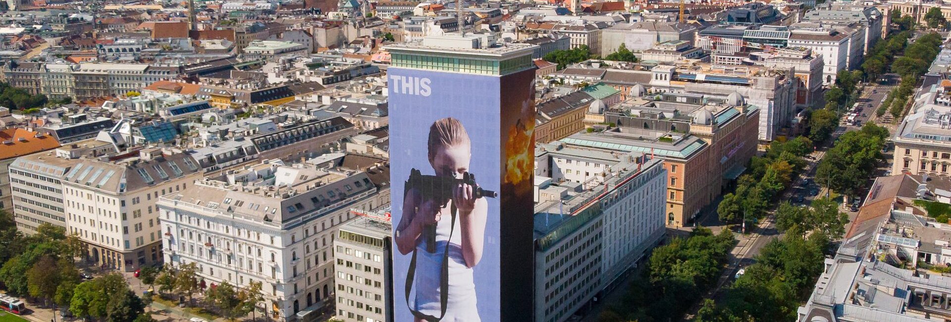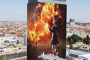 Auf der Vorderseite des Ringturms nimmt ein blondes Mädchen mit einer Maschinenpistole den Wiener Donaukanal ins Visier. Auf der Rückseite des Gebäudes brennt eine Stadt vor den Augen einer überdimensionalen Manga-Figur lichterloh, im Hintergrund sind Menschen vor einer Welle von meterhohen Flammen und Rußwolken zu sehen. Gottfried Helnwein protestiert mit seiner zweiteiligen Komposition gegen Terror und Krieg.